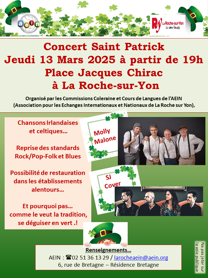 L’Association pour les Échanges Internationaux et Nationaux organise avec le soutien de la Ville de La Roche-sur-Yon jumelée avec Coleraine en Irlande du Nord depuis 1981 un concert sur la Place Jacques Chirac le jeudi 13 mars 2025 à partir de 19h00 accompagné de SJ COVER et MOLLY MALONE. Pour marquer dignement l’événement, les participants sont invités à se déguiser en vert, comme le veut la tradition ! Possibilité de restauration dans les établissements alentour.